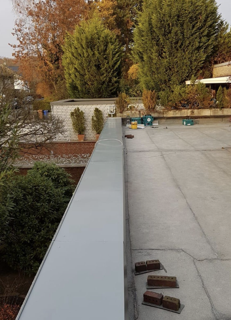 Bei Flachdächern besteht die Traufbekleidung aus Aluminiumblech oder Verbundblech, das mehrfach gebogen wird, um einen geschlossenen Abschluss an der Traufe oder Attika zu bilden. Alle erforderlichen Eindeckungen nach der offiziellen DIN-Vorschrift Dachrandeindeckung werden in unserer eigenen Spenglerei hergestellt. Während des Montageprozesses werden die Fugen regendicht ausgeführt, damit sich die Teile durch Temperaturänderungen schadlos ausdehnen können. Eloxierte oder kunststoffbeschichtete Abdeckungen sind ebenfalls in vielen Farben erhältlich.